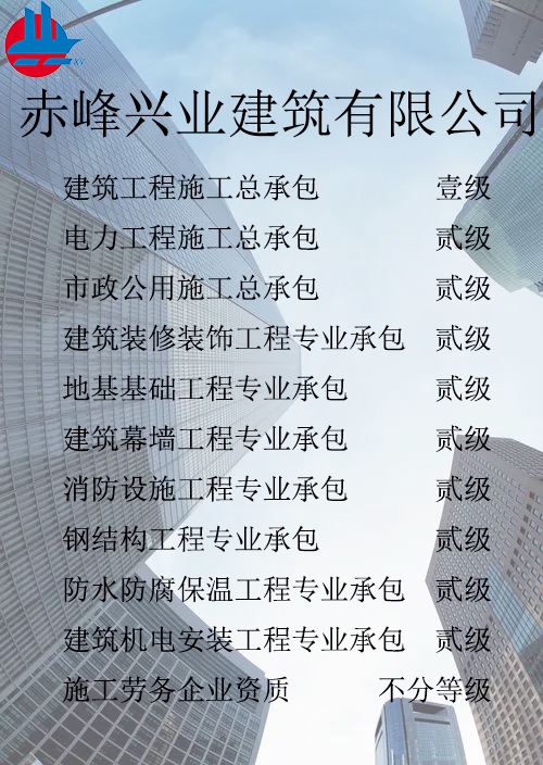 赤峰興業(yè)建筑有限公司簡(jiǎn)介 赤峰興業(yè)建筑有限公司成立于1998年7月,位于內(nèi)蒙古赤峰市松山區(qū)。現(xiàn)已發(fā)展成為擁有建筑工程施工總承包壹級(jí)、電力工程施工總承包貳級(jí)、市政公用工程施工總承包貳級(jí)、承裝、修、試四級(jí)、?建筑裝修裝飾工程專業(yè)承包貳級(jí)、建筑幕墻工程專業(yè)承包貳級(jí)、消防設(shè)施工程專業(yè)承包貳級(jí)、地基基礎(chǔ)工程專業(yè)承包貳級(jí)、鋼結(jié)構(gòu)工程專業(yè)承包貳級(jí)、建筑機(jī)電工程專業(yè)承包二級(jí)、防水防腐保溫工程專業(yè)承包貳級(jí)以及建筑施工勞務(wù)等資質(zhì)的綜合性建筑施工企...